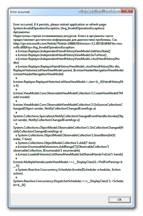 При загрузке хистори турнира вылетела ошибка. причем подобная ошибка не в первый раз уже. (кстати если само окно ошибки от вашей проги, то нельзя ли сделать так, чтобы текст мог копироваться, в частности упоминаемая ссылка, ибо вбивать ее крайне утомительно). Как исправить? Что не так? Браузер файерфокс. Microsoft Silverlight (64-bit) Version: 5.1.40728.0 руки в реплеер залились, но почему-то значительно меньшим кол-вом, чем было в турнире... Я правильно понял, что максимальное кол-во оппов в турнире для расчета 60? А если было больше, можно не вбивать? будет неверно? Не вобьется? Руки обрежутся? Вбивать хистори с того момента, когда есть возможность определить, что оппов максимум 60?