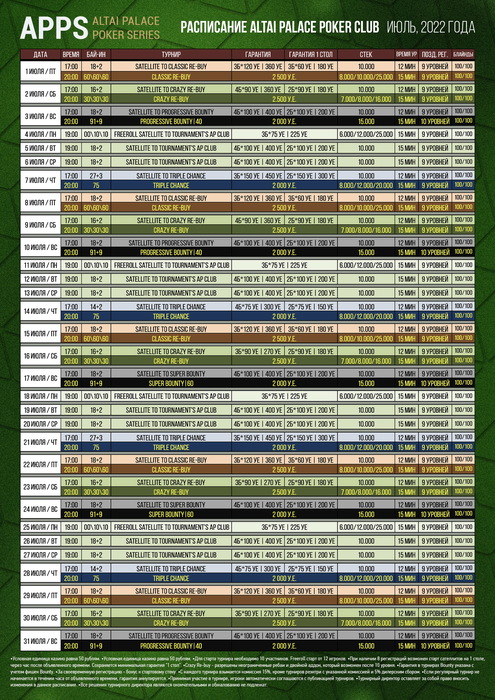 В июле играем весь месяц привычные домашние турниры в чт, пт, сб, вскр. Входы от 30 до 100 уе, гарантии 2000-2500 уе
