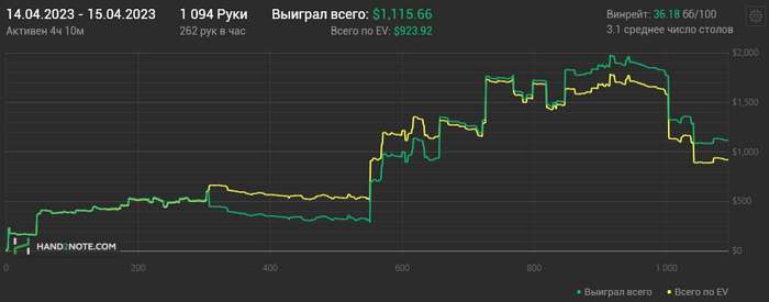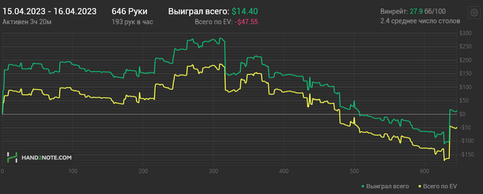 Сегодня тоже на норм концентрации отработал, только в конце 0 столов доигрывал уже полуафк. Пробежать глазами отмеченные раздачи за прошлый день оказалось довольно полезно, жаль, что я раньше так не делал. Но вчера были ошибки, хотя я думал, что сыграл на совесть. Всё равно есть огромное кол-во спотов, в которых я плаваю, даже если стараюсь что-то придумать. Игры становится пугающе мало...
