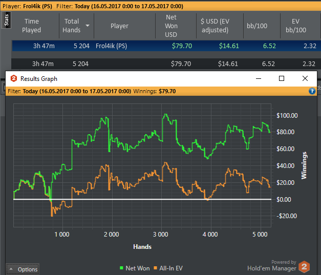 Представляю, насколько хуево щас гавногей регам, которые меня на переезжали. Я, например, щас в порядке. И чувствую себя с результатом -12$ и EV +105$ намного лучше, чем когда 16 мая сыграл +80$ с ев +16$. Я тогда думал, что я лошара и лакер. А вместо радости с выигрыша - одно расстройство. А когда по ев ты тащишь, а бр крепкий, то такие сессии для меня более ценны.