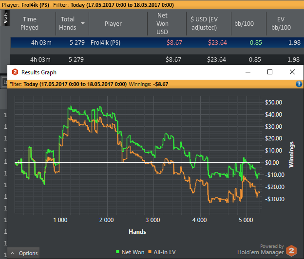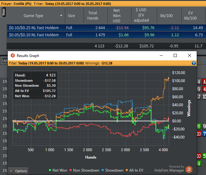 Лишь в даунстрике я возвращаюсь к работе над игрой. Последний раз разбирался в феврале 2017, там блять начало около 15к рук в +480$, а потом 75к рук в -100$. Май напомнил мне февраль. 2 дня +300$, а затем адовые 47к рук.