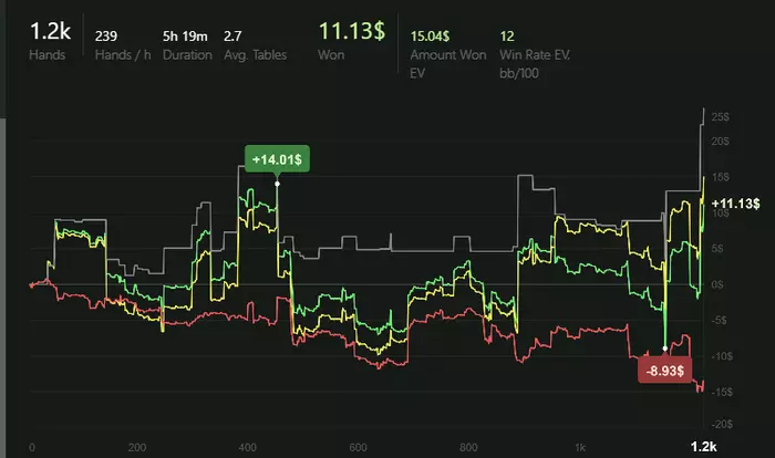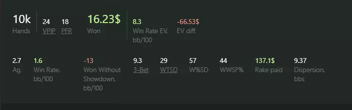 artem66, когда загрузишь график в х2н будешь удивлён, что после рейка ты наиграл примерно в минус 5-6бб/100 по ев . Рейк примерно 13бб/100 , 5,5к рук - это 70$ рейка. И вот уже поляна не кажется такой сладкой. Вернее она сладкая, но профит забирает рум.