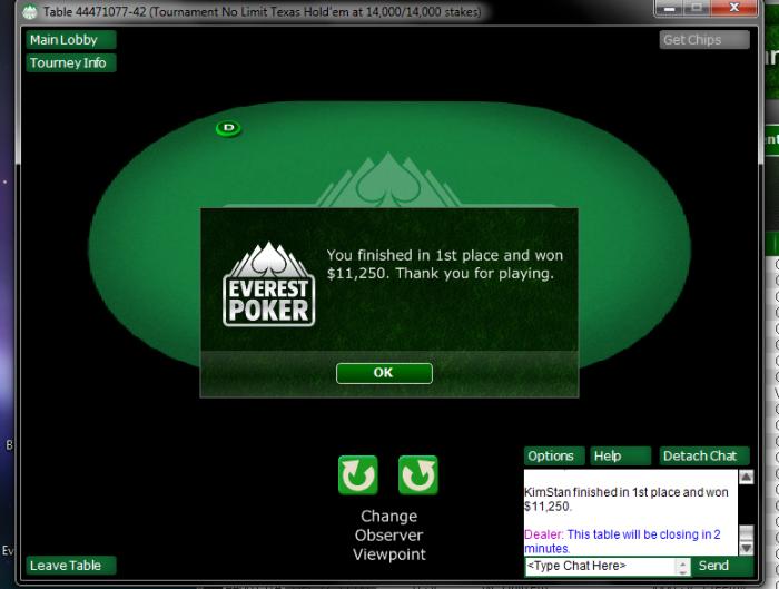 Чуточку недотащил, в ХА вышли с перевесом в его сторону 4к1, выровнялся в какой-то момент, но потом въехал в трипс. В итоге монетка 55 меньше AJо. Но главный прикол не в этом, на самом бабле меня переехал pokernub222 у меня осталось 345 фишек. Каким то чудом въехал в деньги и потом оп-оп-оп :)