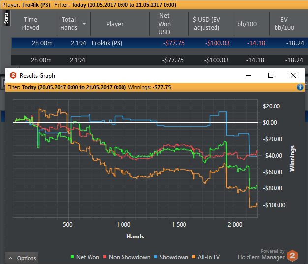 На самом деле, я не совсем хуйней страдал 4 дня. Я просмотрел кучу водов, копался в базах данных. Выяснил, что красная моя умирает в банках <30bb. Видимо я не доблефовываю. Либо выбираю неудачные сайзинги/ситуации. Добавлю еще, что втсд у меня в этих банках 21.4% , а в удачной выборке 207к рук, когда я ебашил в 7bb/100, у меня втсд 17.6%. Я уверен, что тогда блефовал намного беспощаднее. Также уверен, что и тогда ненавидел блефкетчи. Я или тонко фолдил или превращал в блеф. Отсюда и втсд. Я просто заебался, порой кажется, что невозможно снова иметь презентабельную красную линию. И вр на нл25 зум фр 5+bb/100. Вроде и видишь глубже, а на деле играешь в 1.5бб.