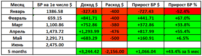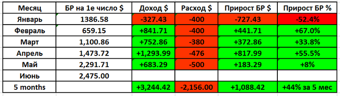 Ну это уже пиздец. +8% можно было округлить до 10ки, а 10% к текущей сумме за месяц это неплохо! А 6.5% подсознание округляет до 5ки. Естественно, я как ССЙМ (сам себе йобнутный менеджер) недоволен и думаю как не обосраться в июне. Все верно, мы помним только конечный результат. А он такой: бр вырос за месяц на 160$.