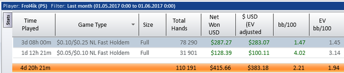 Идешь такой -127$, понимаешь, что потратишь в этом месяце около 500$, +рб мб 250$, и в итоге месяц выйдет -400$!!! А если вспомнить, что апрель был удачным, я плюсанул 1294$, потратил 476$, т.е. +818$ к бр. Т.е. даже рег покердома поймет, что получается средний прирост к банкроллу за 2 месяца = (818 - 400 ) /2 = 209$. ЭТО СЛИШКОМ МЕДЛЕННО!!!