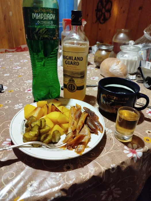 Нету нэта,рыба салака копчёная не разделанная из маяка,ну и вискарь как бы шотландский оттуда допиваю.