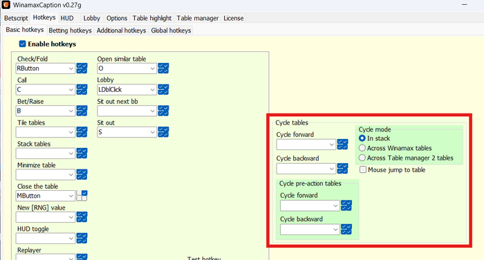 Можно листать столы в стеке, все столы Winamax, все столы Table manager 2, столы Winamax с преэкшеном, также есть опция перекидывания мыши на переключаемый стол (может быть удобно при игре без мыши)