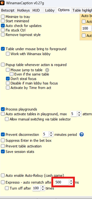LikeAA, Привет! Winamax Caption не регает нормально Expresso через auto rematch. Постоянно пропускает турниры (примерно 2-3 из 10). Не знаю скрин с какой вкладкой скинуть, может я чего не так настроил