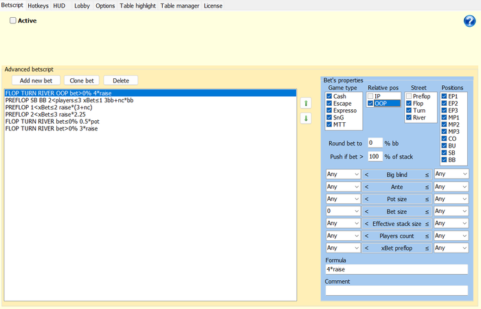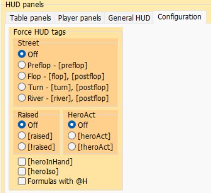 Здесь можно принудительно установить значение некоторых управляющих тегов в заданное состояние вне зависимости от ситуации на столе. Например, можно имитировать ситуацию Flop + HeroAct, в результате чего на столе появятся панели с тегами [flop][heroAct] (или [postflop][heroAct]).