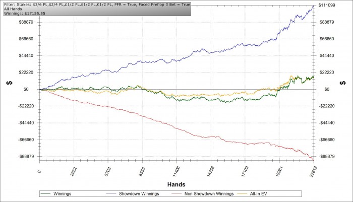 Очень такой неудобный стиль. Ставит много кбетов, почти не выкидывает на мой кбет и атакует почти каждый чек. Широко 4бетит в дипах и играет довольно смело постфлоп.