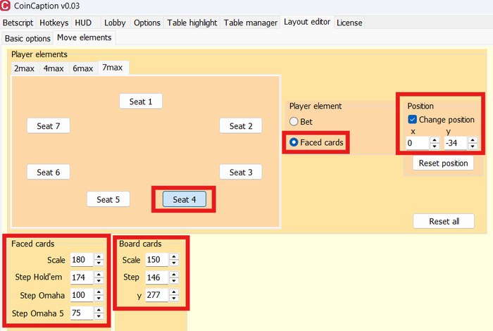 Step Hold'em - расстояние между картами по горизонтали в тех же единицах для холдема. Если Scale и Step равны, то карты расположены примерно вплотную друг к другу (на самом деле в картинках карт есть небольшая прозначная зона и в этом случае небольшая дырка между картами будет). При помощи этой опции можно раздвинуть карты нужным образом или сделать наложение.