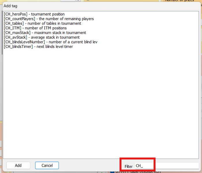 Кроме СН тегов, в программе ещё есть TL теги (их больше, и там в частности можно выводить текущий приз, следующий приз, место, начиная с которого следующий приз начинается и т.д, их в текущей версии есть 23 штуки, тогда как СН только 8). Для их работы требуется открытое турнирное лобби играемого турнира.