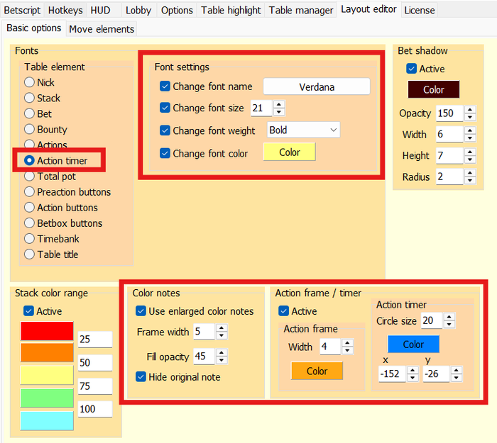 1. Layout editor / Color notes / Use enlarged color notes, Frame width, Fill opacity, Hide original note