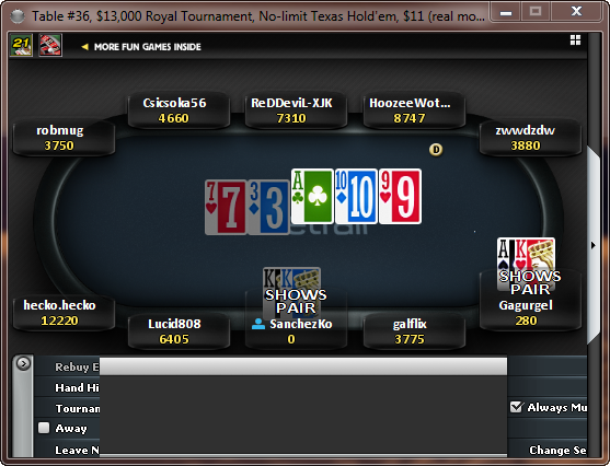 В субботу ездил в Азов-сити на турнир за 10К 1р1а гарант 1КК. Очень хорошо провёл время. Хочу поблагодарить организаторов, в частности Алексея за хорошую организацию и приятную атмосферу! Очень приятно было познакомиться и пообщаться с Мишей audi138tt, ребятами со Ставрополя (с Сергеем который занял 7-е место, общаемся по скайпу, рад личному знакомству), ребятами из команды Dentistа и другими!