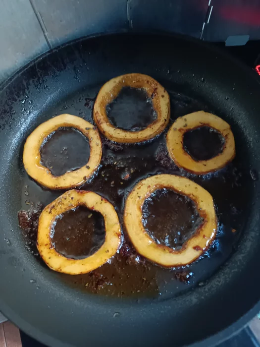 Вот эти кружочки обмакнул в эту смесь и начал жарить.. Муку не добавлял, онли хардкор, только натурпродукт, так сказать....