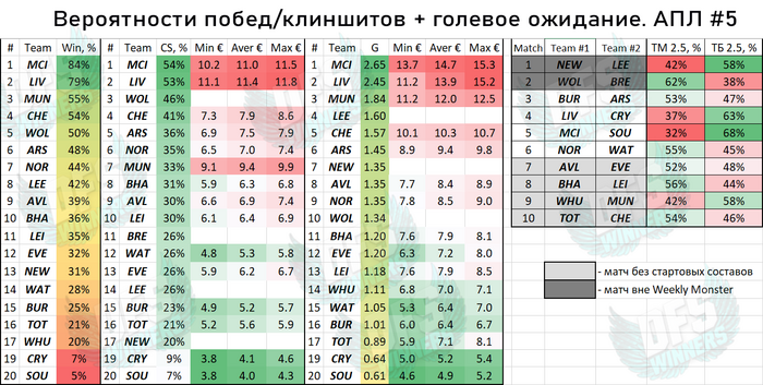 Котировки букмекеров на тур №5 + средний прайс на игроков для Weekly Monster
