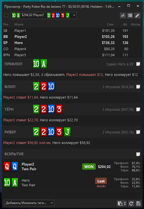 уже устал себе напоминать, что харош быть телефоном. Ну не будет там никогда достаточно блефов. Мы сотку катаем а не 5к. Пофиг, что по солверу это 100% колл. Против поляны такие блаф кетчи вникуда.