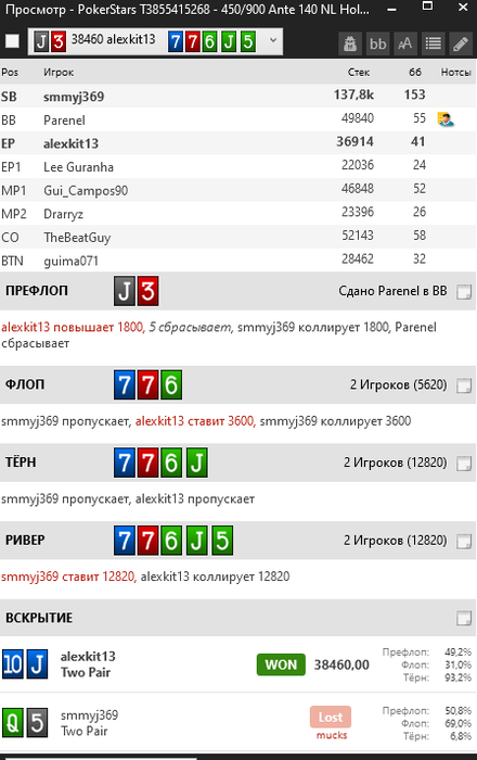 nakazator95, Да ну во первых, а че бы и нет) а во вторых, мне реально стало интересно, ибо с такими лайнапами, в такой борд, да еще и с вводными, что против нас фиш, для меня, на интуитивном уровне, заряжать большую - ужасное действие (Что во многом и было доказано, когда чувак не уронил Q5)