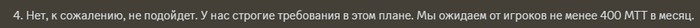 если школа прямо говорит, что нужно 400 - ок, но я не буду обещать что 400 отыграю, а буду играть 300 и надеяться что меня не кикнут. Скорее всего так оно и есть, (1 человек в ЛС мне отписал что его не кикают, хотя играет меньше) Но если бы мне школа прямо это написала - ок, я бы вступал и отыгрывал свои 300мтт. Но если они говорят прямо что 300 мало, 400 нужно - ок, тогда я не вступаю