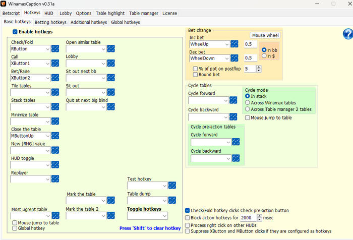 Насчет колесика мышки и ставок. Да у меня на все другие кнопки мыши стоят бинды и все работают. В том числе, например, и закрытие стола по нажатию колесика. Так же в румах где без кэпшена можно ставку колесиком регулировать оно тоже работает. Но с вот такими настройками на винамаксе и коине колесико не работало