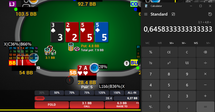 Когда стол в бб, ставки и пот отображаются округлёнными до 0.1бб, поэтому делить 3.1/4.8, чтобы определить размер ставки с точностью до процента, довольно бессмысленно