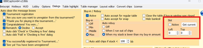 LikeAA, привет, а можно как-то сделать в 888 кэпшене, что бы когда очередь в вейт листе дошла до меня для посадки за стол, то окно с байином и подтверждением посадки вылазило на основной монитор (задать координаты где оно будет появляться). Лобби на втором мониторе и часто пропускаю такие моменты.