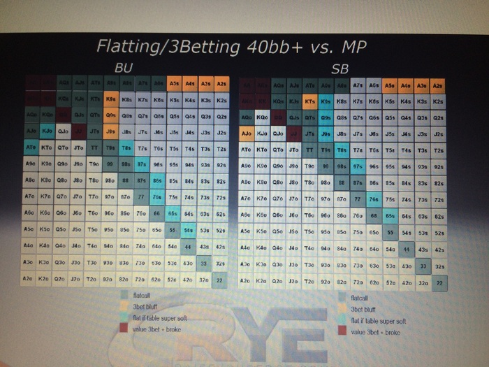 В твоем спектре да, в моем нет. Я cтавил так в неизвестного, это не по статам. Спектры трибета отличаются от кеш, по одной простой вещи, в кеш стеки 100бб и поэтому там в целом линейный спектр 3бета, так как ты не получаешь пуш, а получаешь 4 бет и может с большей частью поколить и играть постфлоп. В Мтт же часто стеки такие, что делая 3бет например на KQs и получая пуш ты фолдами просто будешь сжигать эквити неплохой в целом руки. Поэтому если ты посмотрел стримы инвокера, как он в зуме пуляет 3беты на мастевых связках и парах от 8ок и начал на автомате также делать в мтт это будет ошибкой. Также в мтт с килополями у оппов никогда не накопится достаточно инфы по 3бетам, они просто не будут так часто попадать с тобой за один стол, чтобы набрать статы и начать лузовей пихать в тебя. Теперь вывод из этого всего, что большую часть тузов мастевых, которsе нам жалко будет выкидывать на пуш, мы должны заводить колом и играть постфлоп, а часть разномастных IP уводить в 3 бет с планом ставить цбет на подходящих текстурах. Это причем не очень лузовато, я видел как топы в мтт без позы J3o в трибет уводят. Поэтому говорить "в никуда" мне кажется несколько опрометчиво. Неплохо бы конечно посмотреть по базе своей в плюс это трибеты идут или нет, но я в этих фильтрах не понимаю ничего, сколько раз не пробовал ерунда получается какая то.