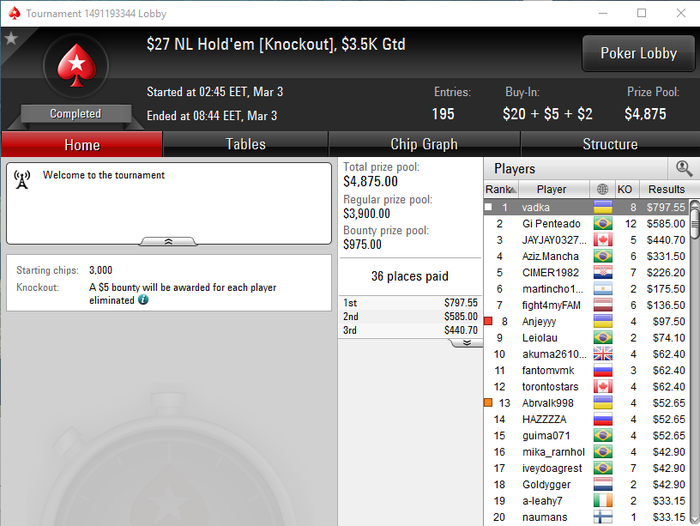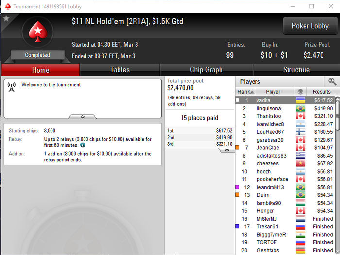 Думал, что буду играть оба дня Гранд Ивента, и большую часть вечера выглядело именно так, но за последние три уровня игры удалось раскрутиться, и закончил День 1А со стэком 166К (второй день начнётся с 2К/4К блайндов). Средний порядка 153К, так что комбинация малой вероятности набить больший стэк + дополнительного баина (+возможные ре-энтри) + инвестиции еще 8 часов времени убеждает меня в том, что ехать играть День 1B не стоит.