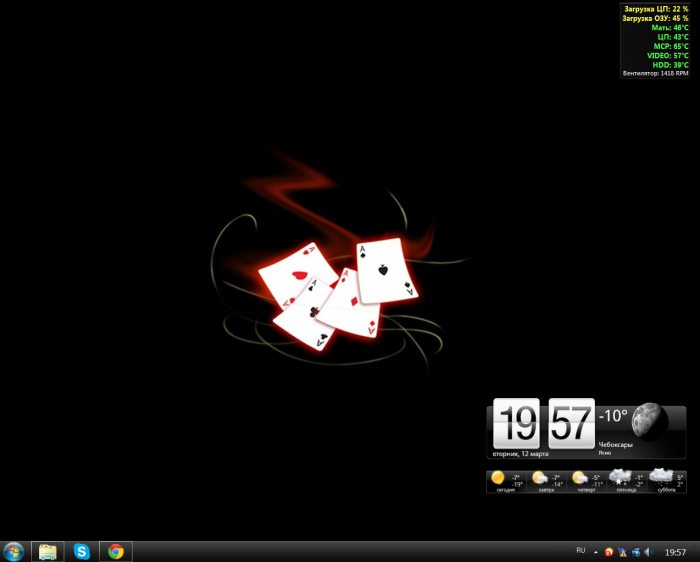 Попробовал поменять разъёмы на матери - ничего. Почитал темы про кулеры, радиаторы и процессоры. Разобрался в теме нормально, приценился и т.д. Отсоединил вентилятор от радиатора и пошёл к дедушке. Прозвонили это дело, затестили - всё ок. Запускаем - не работает. Пальчиком ему помогли - закрутился родненький. Выключаем, включаем - работает уже сам. Пошёл домой, подсоединил всё, врубаю - не двигается. Пальцем помог - заработал. Выключил, включил - сам работает. Судя по всему после длинного простоя сам не стартует. Послежу, узнаю точно в дальнейшем. Так или иначе проблему решил. Разобрался в теме, что уверен ещё ни раз пригодится. Кстати ради такого дела разобрался с панелькой от AIDa, и выел интересующие меня циферки на рабочий стол. Переименовал, раскрасил, подогнал цвета и размеры шрифта под свой вкус. Короче, по-моему получилось здорово.