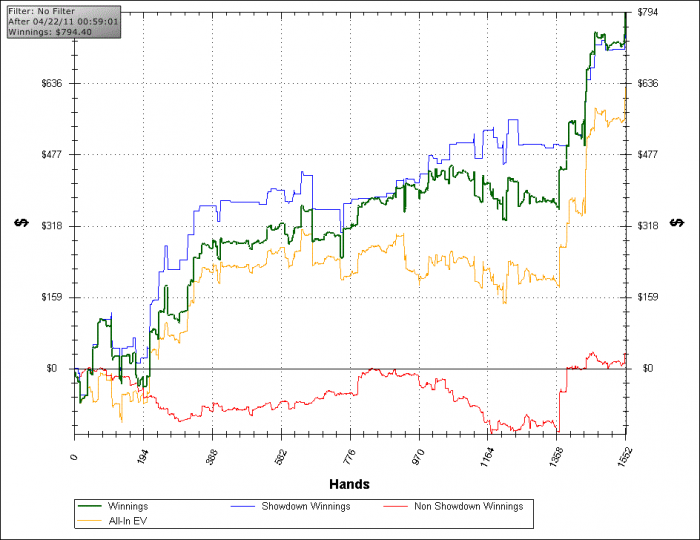 Однако forhayley рассказал про эту раздачу много интересного в скайпе, а точнее про коллы рейзов/пушей, которые мы получаем в ответ на ЯВНО доборные ставки. Я из этого сделал вывод еще раз пересмотреть диапазоны доборных ставок с разными оппонентами, но и про расширение диапазона колла в таких ситуациях при игре с постоянными оппонентами тоже следует подумать.