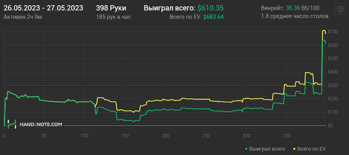 Решил выйти в плюсе, немного отдохнуть сегодня и сохранить позитивный настрой. Играть стал лучше, снова начал погружаться в раздачи, стараться подольше подумать и т.д.
