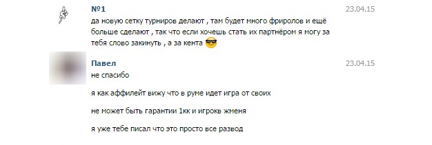 [5/23/2015 3:06:19 PM] Tribol: Вы мне пишите что покерофф и вы партнеры, только не понятно почему они согласны с нами работать, а вы простите за выражение " Пытаетесь обосрать наш рум "