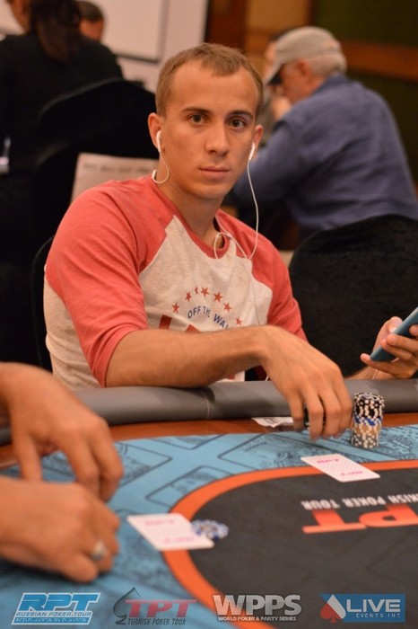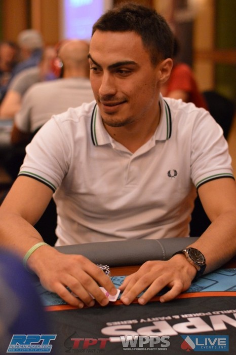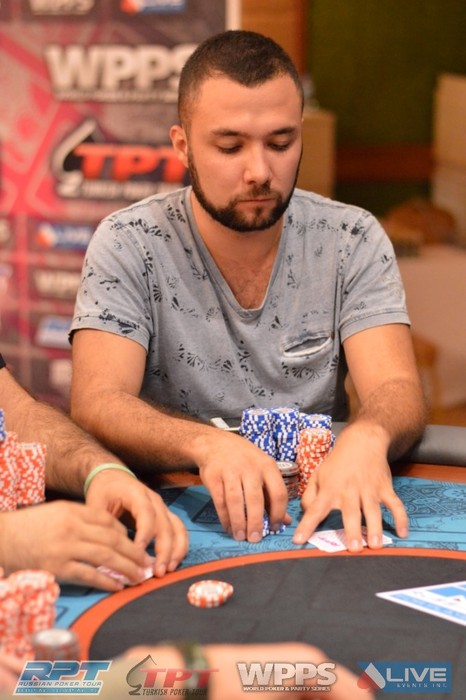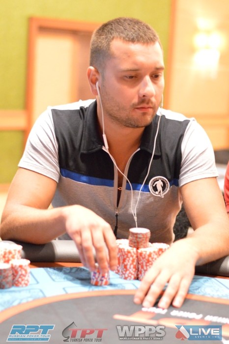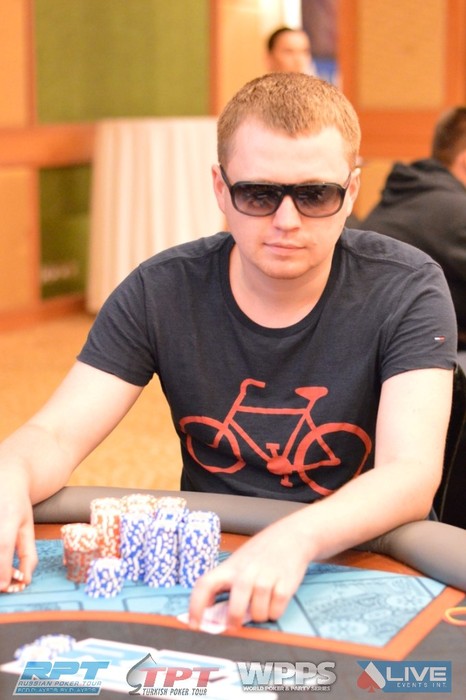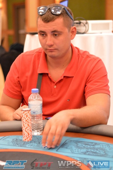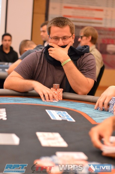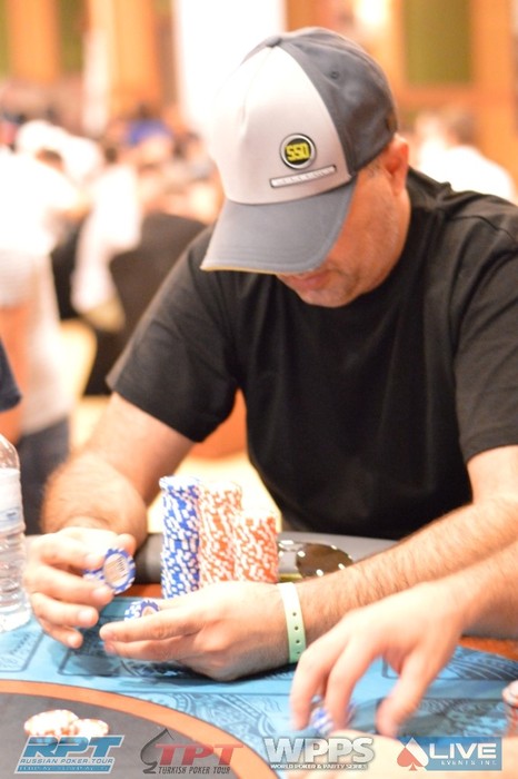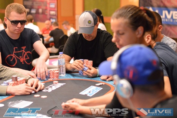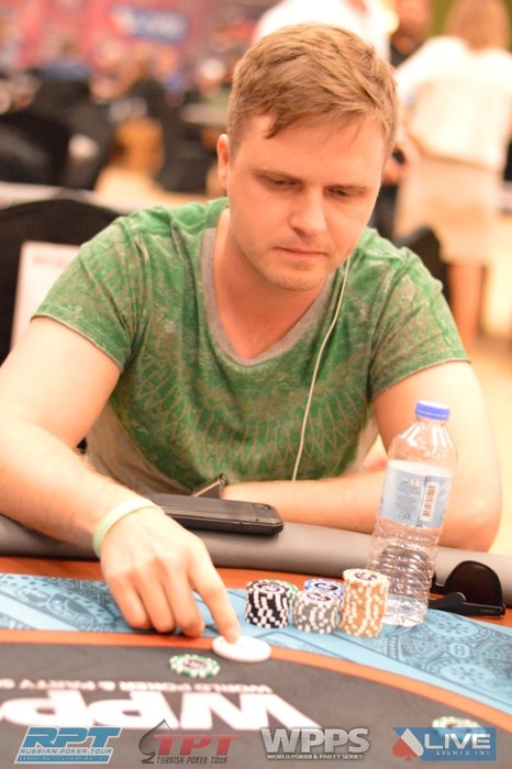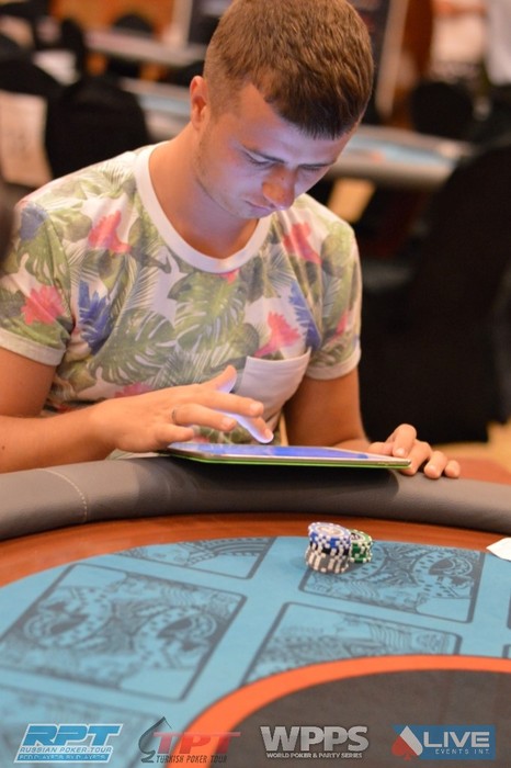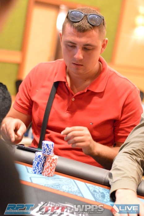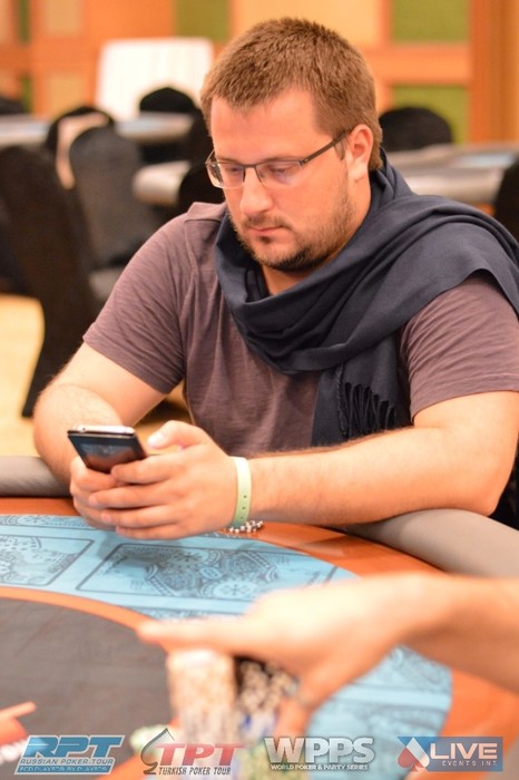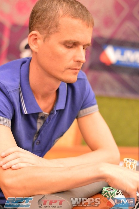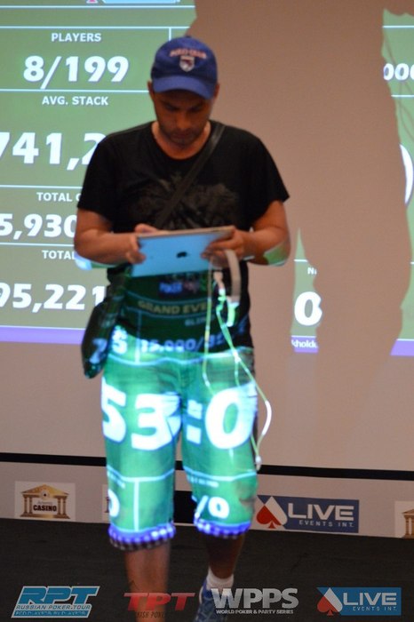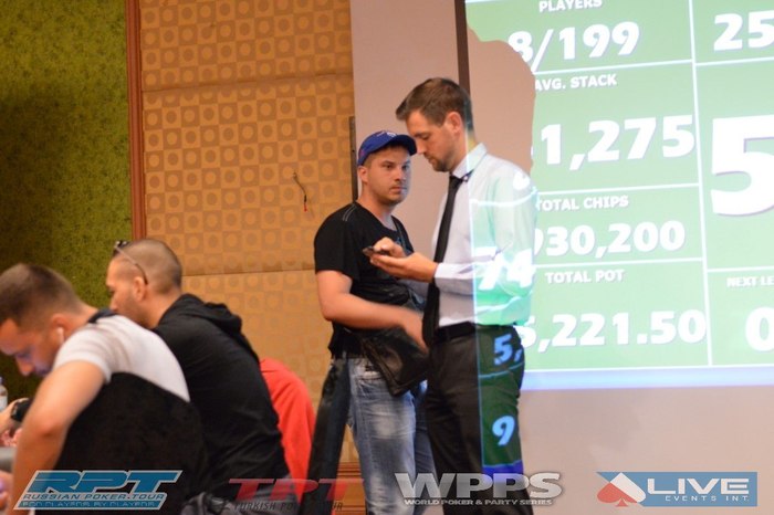MaloyAndSo, да, Евгений в турнире. Стеки можно будет точно посчитать только в перерыве финального стола, однако это фото сделано буквально пять минут назад. Только что, кстати, был аут и в игре осталось 12-ть человек. Выбывший попросил не указывать его имени.