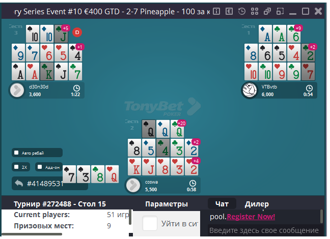 Всем привет, закинул я в итоге на Тони 14 евро (1000 рублей) раскрутился до 34 и стал ждать первого турнира серии, начал хорошо, но на поздней стадии ребаев пришлось взять 2 ребая подряд. Дальше прошёл без аддона, поймал фантазию с повтором и хорошо держался до бабла.