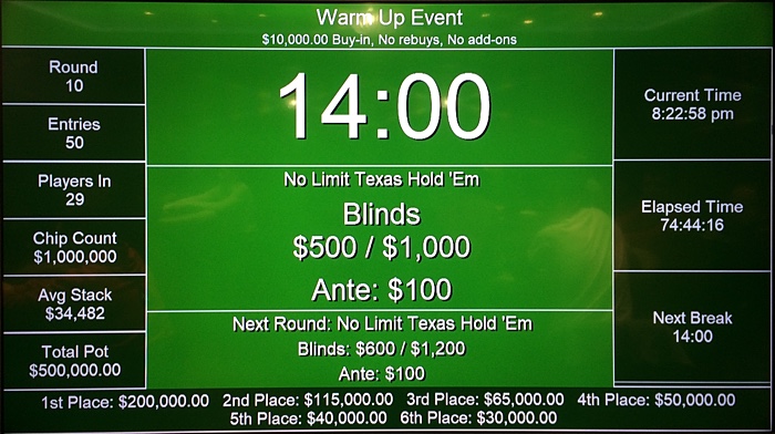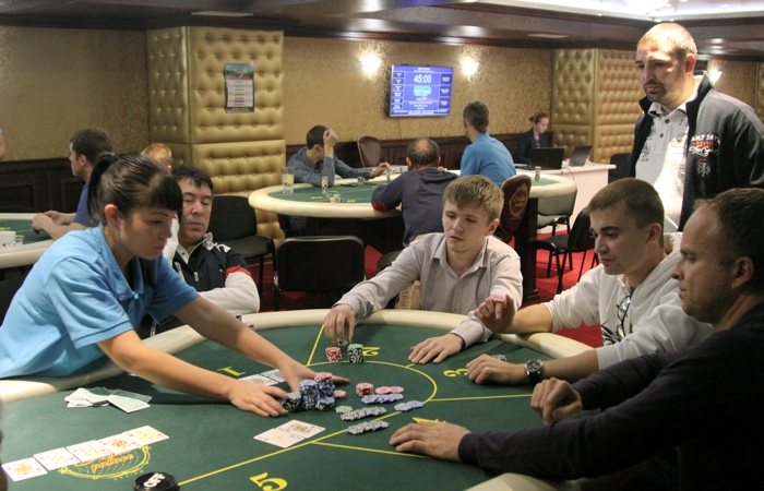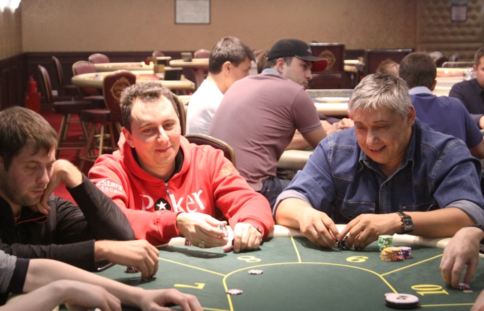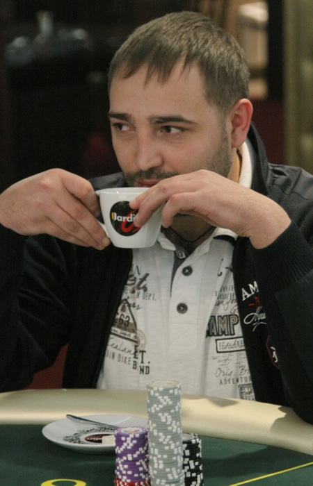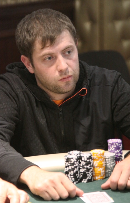 Есть еще один аут. Турнир покинул один из самых ярких персонажей - Евгений Попов. Он каждый день сражается на рулетке, и за покерным столом ему временами откровенно скучно. Так, вчера, сев в Warm Up примерно на шестом уровне, принялся "экспериментально" ставить олл-ин каждой рукой. Против такого лома никто не смог найти приема, - и Попов закончил турнир с одним из самых крупных стеков. Продолжал куражится он и в сателлите, и в продолжении варм-апа...