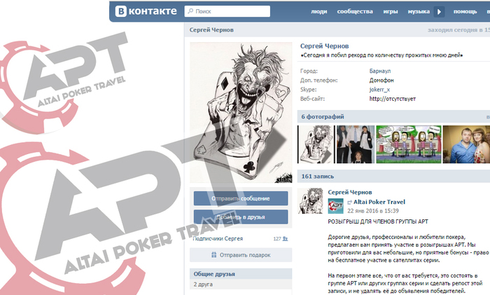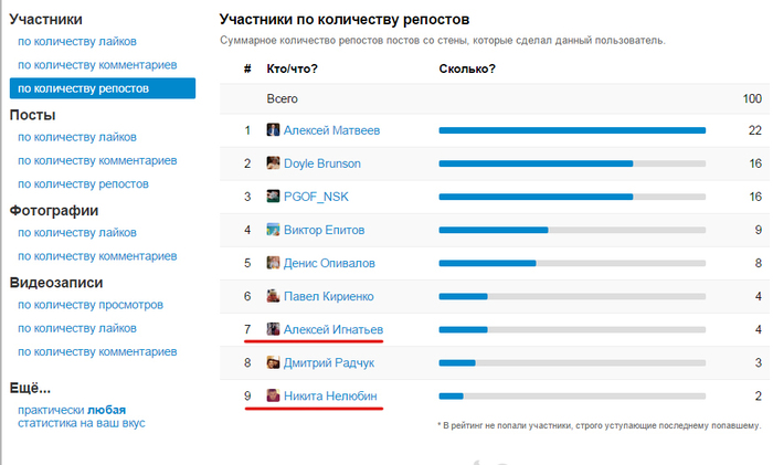 Дорогие друзья. Сегодня, 30-го января, были подведены итоги приятных бонусов от APT в группе ВК. А начнём мы с конкурсов репостов, для участия в котором вам лишь нужно было сделать репост записи, состоять в сообществе и ждать) ... И победителем в розыгрыше стал Сергей Чернов из Барнаула, который получает полный пакет на шаг-1, а именно 150р. в виде event money. Поздравляем Сергея! Просьба отписаться в комментариях, оставить свой ник под постом или лично администраторам. ... Второй розыгрыш получился довольно близким, где в борьбу включились три самых активных подписчика, оставив всех позади. С каждым днём они на несколько шагов опережали друг друга, меняя позиции. Но итог таков - победитель определился по количеству набранных очков, за всю активность, как и было указано в условиях розыгрыша. А именно - комментарии, лайки и репосты. Плюсуя всё это, мы получаем результат, и сейчас огласим его. Напоминаю, что произошла небольшая опечатка, за которую организаторы приносят свои извинения. Три победителя получат вознаграждение в качестве 250 event money каждому, что в сумме равняется 750 призовых денег. Хоть победители и выявлены, хочется формально прибегнуть к цифрам, и обратить внимание на результаты этих ребят, которые активно участвуют в жизни APT. ... И так, по количеству лайков а первом месте - Никита Нелюбин (124), на втором - Tyoma Vdovin (122) и на третьем - Алексей Игнатьев (121) ... Записки судей обращают внимание на количество репостов - Алексей Игнатьев (4) , Никита Нелюбин (2) ... И последнее, это активность в комментариях. На первом месте Tyoma Vdovin (19), на втором - Никита Нелюбин (14), и на третьем - Алексей Игнатьев (9) ... И того в сумме. Никита Нелюбин 124+2+14=140 Tyoma Vdovin 122+19=141 Алексей Игнатьев 121+4+9=134 И в этой нелёгкой активной борьбе места делятся следующим образом 1 - Tyoma Vdovin, 2 - Никита Нелюбин, 3 - Алексей Арсеньев. Поздравляем победителей, а всем остальным желаем удачи!!!