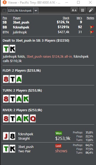 Салют! Последние дни катаю и катаю, проходы есть. НО ничего не складывается в дипранах, сегодня в ТОП14 регулярки по 5.5 на пати, сначала мои AJ меньше А10 за очень хороший стек, следом 22 меньше JK, ну и за возвращение в игру Q8s запушил с сб в бб так 105s колл ну и стрит на одну карту положили( На 888 в ТОП25 1010 меньше AQо. Как то так, вроде и близко, но не доезжаю. Завтра поработаю с тренером, надеюсь на улучшение ситуации! Всем добра!