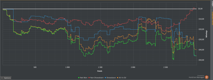2. 10:30-11:30=60мин | 592 руки | ...-19,40.. | -46,93 | 3 с 10 | Comment: Даааа… Все очень печально одна криво сыграная 1 пограничная одна супер агрессивная, игрой доволен, но результат жесть… упал с 4 столов до 3 столов НЛ10… Texника: одна пограничная, одна кривая, одна супер агрессивная, без грубых. ; Rating: 3 с 10 . Психология: видно когда не складывается и есть ошибки что проседаю… ; Rating: 3 с 10 .
