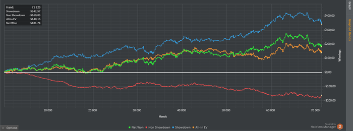 Start Bankroll 831,95$; Stop Banrkoll 786,31$; Cтолов 6; Мини сессий 6; Рук: 2963; Время = 300 мин; Результат = -45,64$ (+10RB); bb/100 = -14,08; Моя оценка = 0 з 10. Цель на день Net Won(14$) выполнена на -326%; Цель на день Hands (2500) выполнена на 118,5% Цель Руки на третий игровой отрезок за все дни (100К) выполнена на 71,2% (71281 рук); Цель NW & RB на третий игровой отрезок за все дни NW (400$) выполнена на 45,4% (181,74$), RB (100$) выполнена на 100% (100$); Comment: Что-то в голове сидело и мешало играть, попробую 13 дней отыграть на НЛ10 зум дам для этого 25БИ, если что-то пойдет не так то вернусь назад на НЛ5 и буду играть рег столы и забуду про зум.