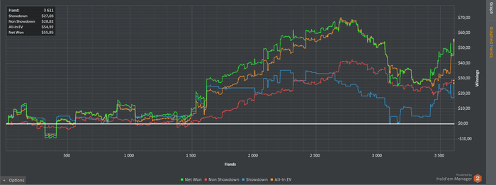 Cтолов 6; Мини сессий 6; Рук: 3611; Время = 360 мин; Результат = 55,85$ ; bb/100 = 18,3; Моя оценка = 5 с 10.