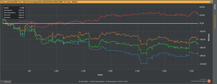 Start Bankroll 688,57$; Stop Banrkoll 730,89$; Cтолов 6; Мини сессий 6; Рук: 3766; Время = 360 мин; Результат = 32,37$ (+10RB); bb/100 = 5,80; Моя оценка = 5 с 10. Цель на день Net Won(40$) выполнена на 80,9%; Цель на день Hands (3600) выполнена на 104,6% Цель Руки на пятый игровой отрезок за все дни (333К) выполнена на 58,5% (195060 рук); Цель NW & RB на пятый игровой отрезок за все дни NW (2000$) выполнена на 11,1% (223,85$), RB (200$) выполнена на 137,5% (275$); Comment: Даун продолжаеться...