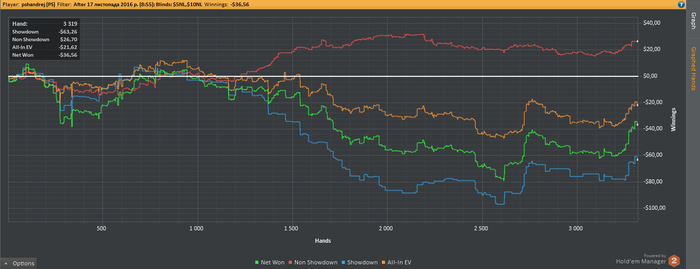 2. 10:30-11:30=60мин | 697 руки | ...-34,95.. | -43,96 | 5 с 10 | Comment: Жесточайщий даун… 4% доехжают и без ЕВ… Просто ЖЕСТЬ… Texника: Норм, без грубых… ; Rating: 5 с 10 . Психология: Норм, на уровне… ; Rating: 5 с 10 .