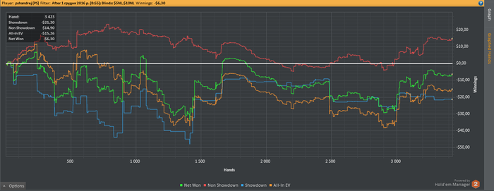 Start Bankroll 709,57$; Stop Banrkoll 758,85$; Cтолов 6; Мини сессий 5; Рук: 2627; Время = 360 мин; Результат = 14,58$ (+25RB); bb/100 = 14,0; Моя оценка = 5 с 10. Цель на день Net Won(60$) выполнена на 24,3%; Цель на день Hands (3600) выполнена на 72,9% Цель Руки на пятый игровой отрезок за все дни (333К) выполнена на 66,4% (221324 рук); Цель NW & RB на пятый игровой отрезок за все дни NW (2000$) выполнена на 15,8% (13,54$), RB (316,11$) выполнена на 175% (350$); Comment: АП+Даун уже как стандарт...