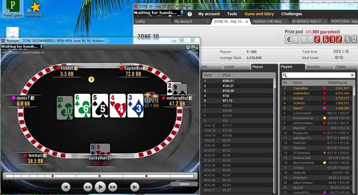 пока играл финалку, параллельно шла предфиналка билдера за 7, там тоже шёл неплохо, но потом потерял шашки и уже со стеком в 30 бб(10-й стек) погнался за коротким (7бб) с AQs и впоялся в AK у типа на блайндах (30бб+), аут 12-й