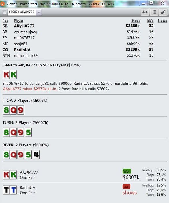 в топ 6 сделал глупость. я на баттоне стилил с А9 СБ ББ кол, флоп А34(две масти) и как обычно принял быстрое решение, вколил чек-рейз пуш от фиша с ББ, там АД, хотя я рассчитывал увидеть дрова, тузы хуже, ну и пож мелкие карманки. сразу из чипака стал с 6-м стеком. но потом удалось быстро восстановится, вначале АТ против KJ против того же фиша. и через раздачу сосед по блогу вколил мой 3бет пуш с ТТ , у меня КК. на первый взгляд минусовенько, но в конфе посчитали типа норм.