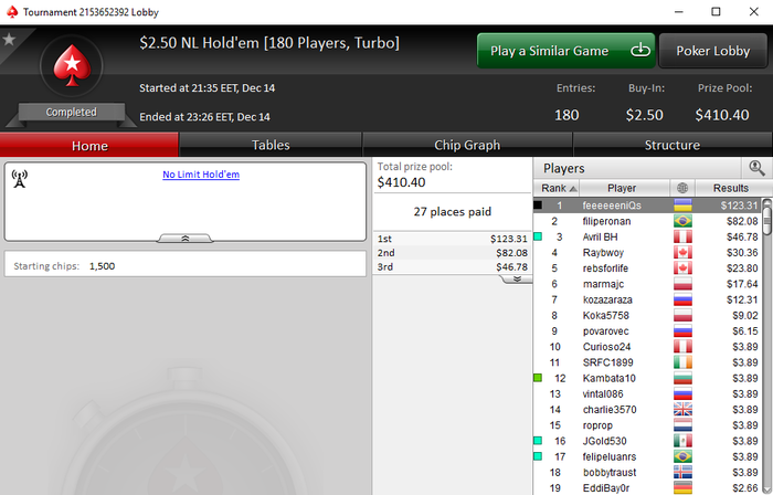 Уже хотел стартовать всякие гиперы и турбины за 0,5-1, но спасибо соседним блогам, благодаря которым узнал, что старзы досрочно завершили акцию. Видимо не ожидали, что столько регов спустится на лимиты ниже и втащат неприличное кол-во туров. Конечно обидно, когда уже пол задания выполнено, но еще две предфинки более менее порадовали: