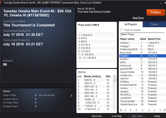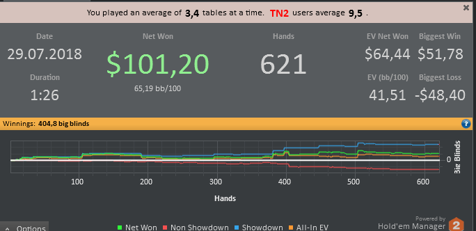 В холдем пока идет тяжело, но как ни странно я показываю там самые высокие винрейты пока, а вот по хайле все ужасно. С НГ я отыграл 700 турниров, без учета стразов и не фига не выиграл, уже больше 100 БИ стрикую в нее. Пора тренироваться...