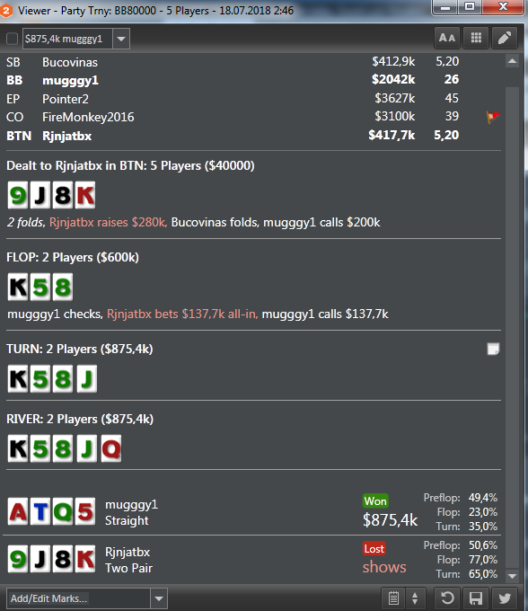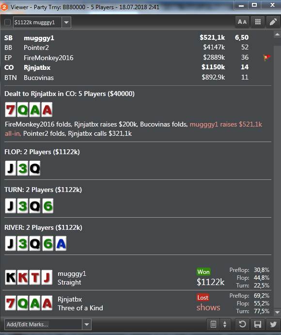 Стараюсь катать по возможности и работать. Сейчас вроде пик сезона-надо срубить по легкому и на зимовку. Брат жены приехал также помогает, поэтому время для катки есть. На старзах играю парочку микромиллионников (в основном продолжаю закатывать там), в основном катаю на пати. Думал продавать хотя бы 50% на 55 пло и выше, но уже решил катать от себя, без реэнтри, реэнтрюсь только по 27.5 и по 22. Вроде начало получаться. Стараюсь смотреть стримы Минтона и вчера как раз оказались с ним на финалке турбика по 22, где я проиграл ему с ККxx< AAxx пре и вылетал 4-ым.