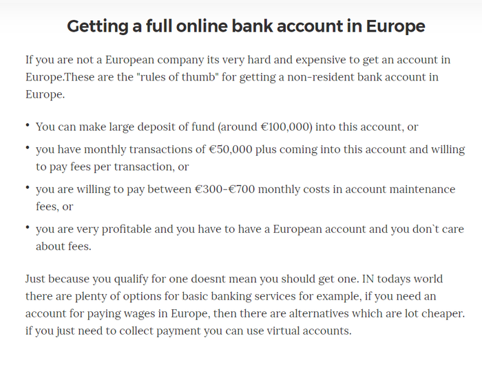Почекал инфу о зарубежных картах и счетах в зарубежных банках для не резидентов EU. Если резюмировать, то: Хрен тебе, не европейцу счет в банке. Либо плати за обслуживание в месяц сумму ожидания рега 10 лимита спинов за тот же месяц. В этом скрине дальше идет убалтывание пользоваться их услугами виртуального банковского счет. Но для этого, тебе нужно иметь ооо или ип и быть готовым предоставить кипу документов. Но все же, там есть опция геймблинг, пока что не вдавался в подробности. Заполнив анкету, они высылают тебе еще большую анкету, где просят рассказать чем ты занимаешься подробно, для нахождения кейса именно для тебя. Кому интересно, сайт.